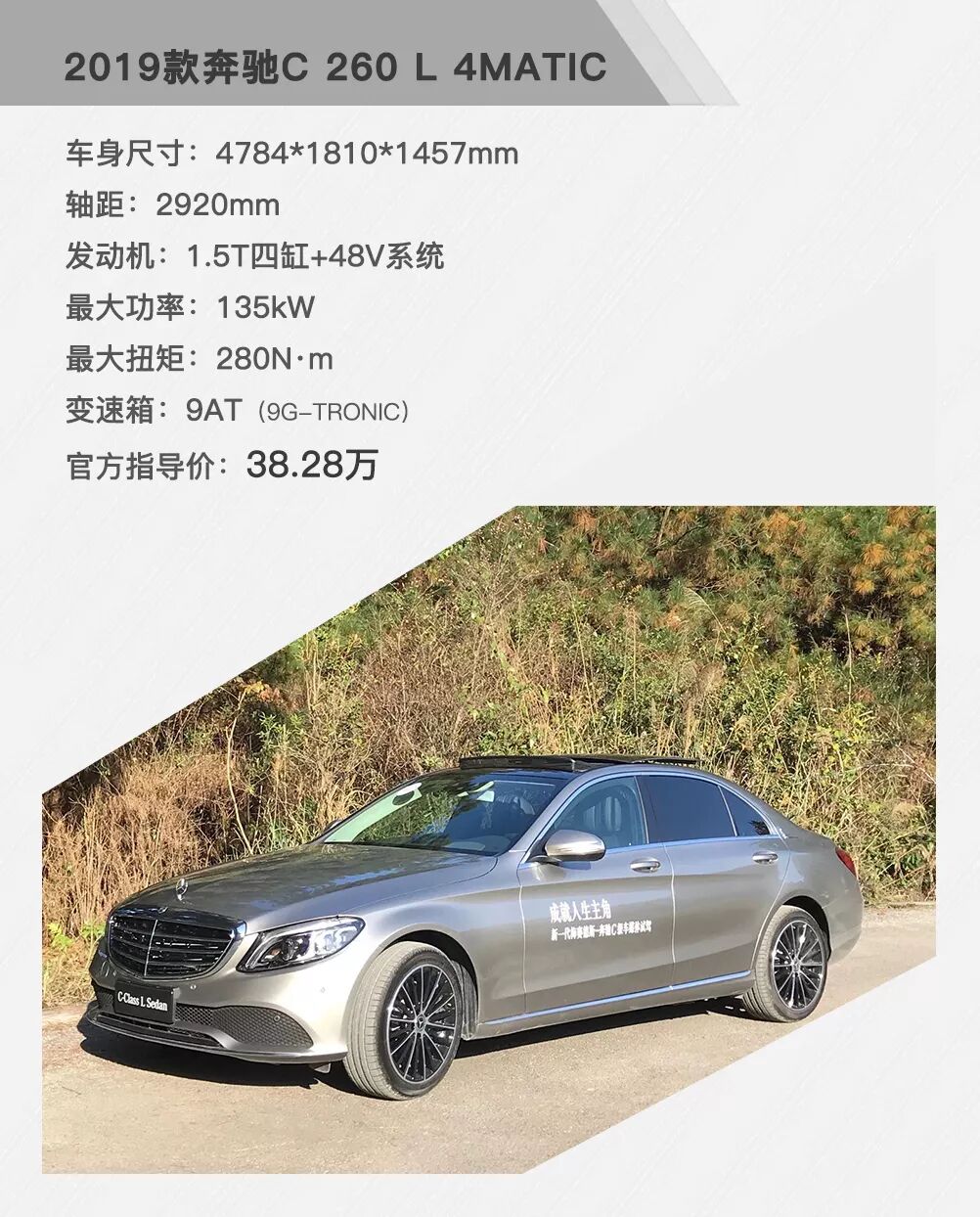 搭载这套1.5T动力总成的车型共有六款,分别是标轴运动版的后驱和四驱、长轴运动版的后驱和四驱以及长轴版的后驱和四驱车型。本次试驾提供了这六款配置中搭载四驱系统的三款。而笔者试驾的车型就是占据销量主力的长轴版四驱车型,也就是全称为:2019款奔驰C 260 L 4MATIC的这款。
