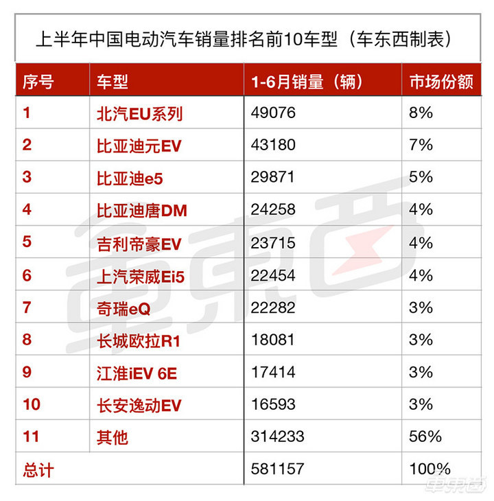 虽然品牌销量遥遥领先,但比亚迪的单一车型销量却被北汽EU系列压了一头。今年上半年,北汽EU系列共计销售4.9万辆,而比亚迪元EV则卖出了4.3万辆。