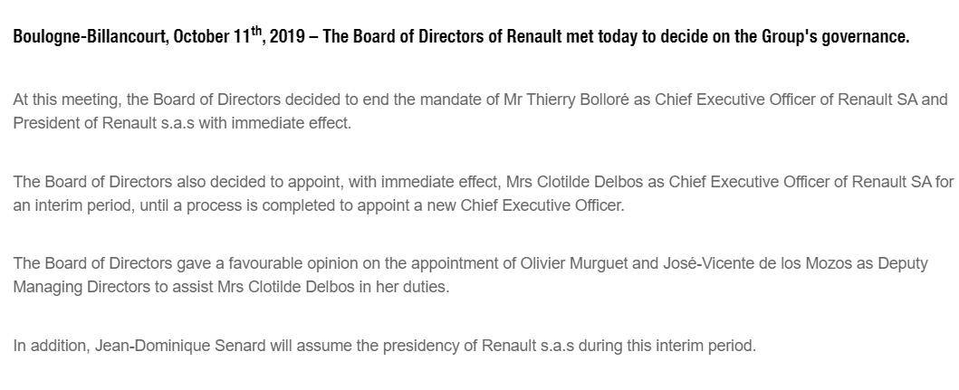 10月11日,雷诺公司董事会周五投票通过了免除CEO 博洛雷(Thierry Bollore)的抉择。官方声明中表明:“董事会决议完毕博洛雷作为雷诺公司首席执行官和总裁的任期,当即收效。”
