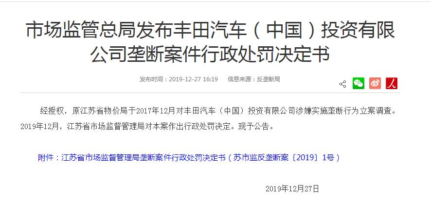 处分决议显现,经查,2015年6月至2018年2月,当事人区域出售司理经过举行经销商会议、巡店、微信告诉等方法,要求江苏省内经销商在互联网渠道(轿车之家、易车网)出售雷克萨斯轿车时,一致依照各车型主张零售价进行报价,经销商不得私行下降网络报价。