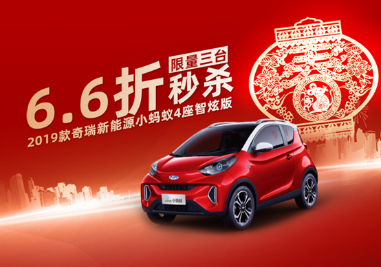 12月31日起,奇瑞新能源轿车苏宁旗舰店敞开2019款小蚂蚁预定秒杀活动,1月2日、1月6日、1月10日20:00 别离开释一个6.6折购车名额,预定成功的用户即可参加秒杀,以1.2元的价格抢购2019款奇瑞新能源小蚂蚁4座智炫版6.6折的购车权,抢购成功的用户将以50028元的价格购得价值百科75800元的2019款奇瑞小蚂蚁(参数|图片)。