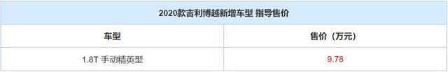 日前,咱们从吉祥官网得悉,2020款吉祥博越新增一款1.8T手动精英型车型,价格为9.78万元。